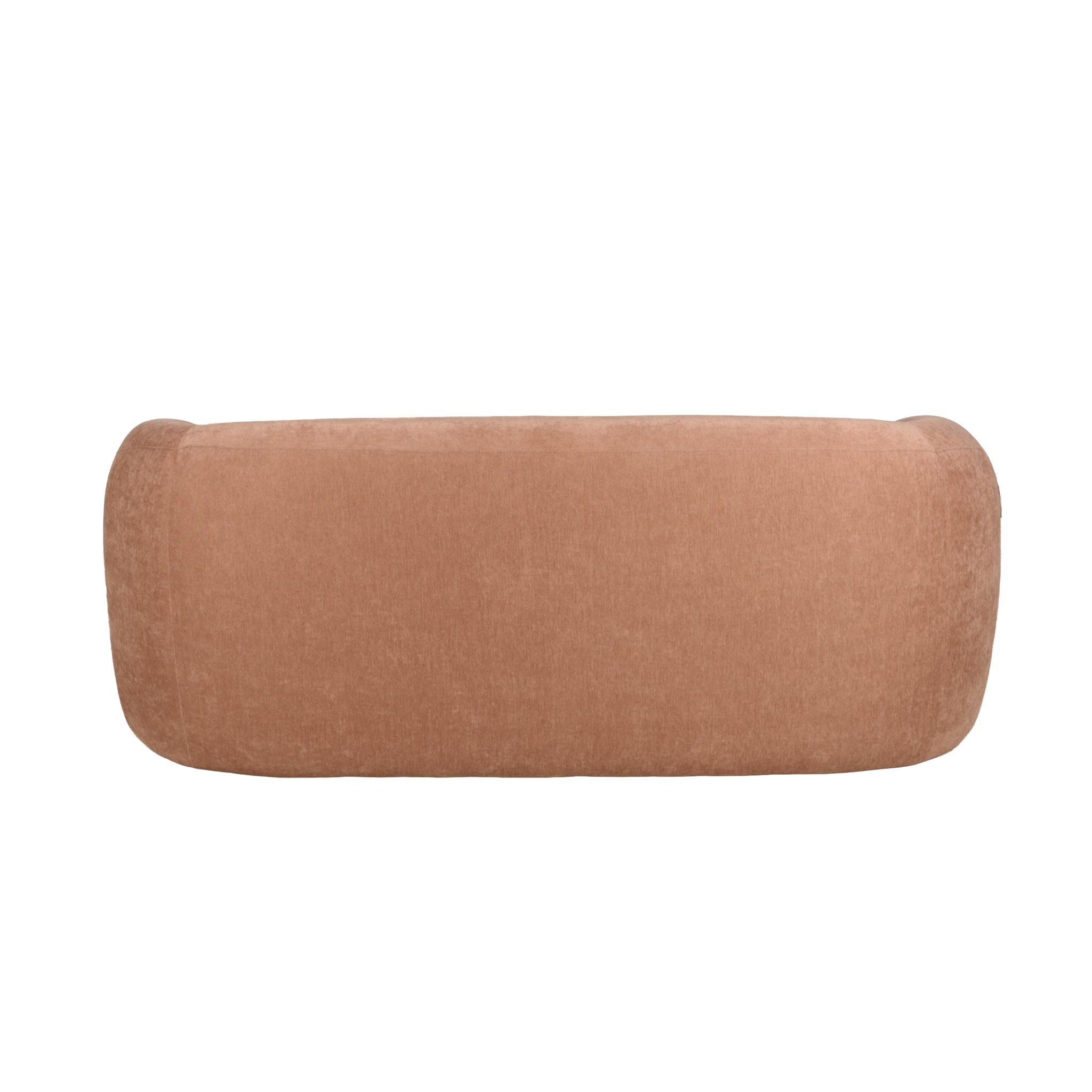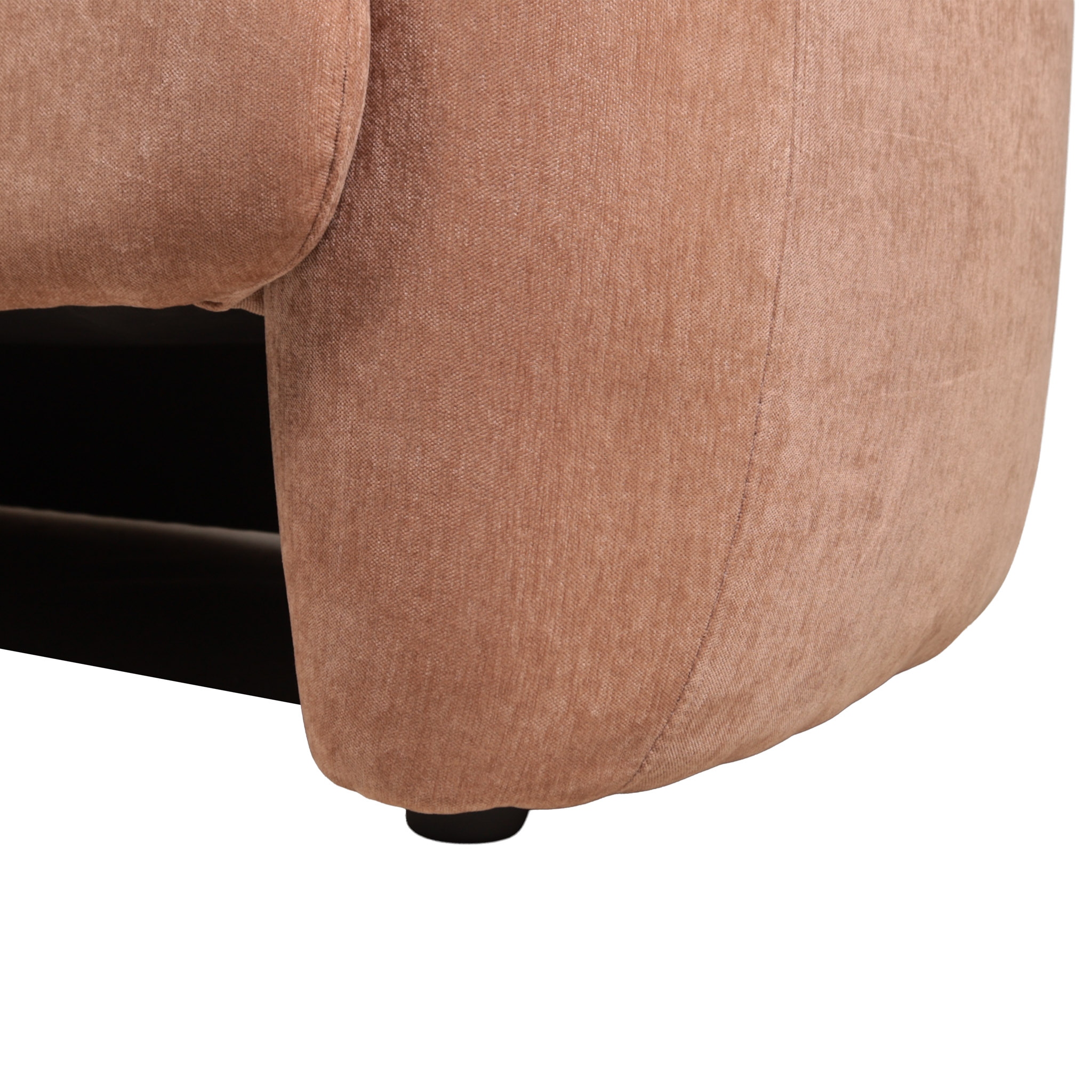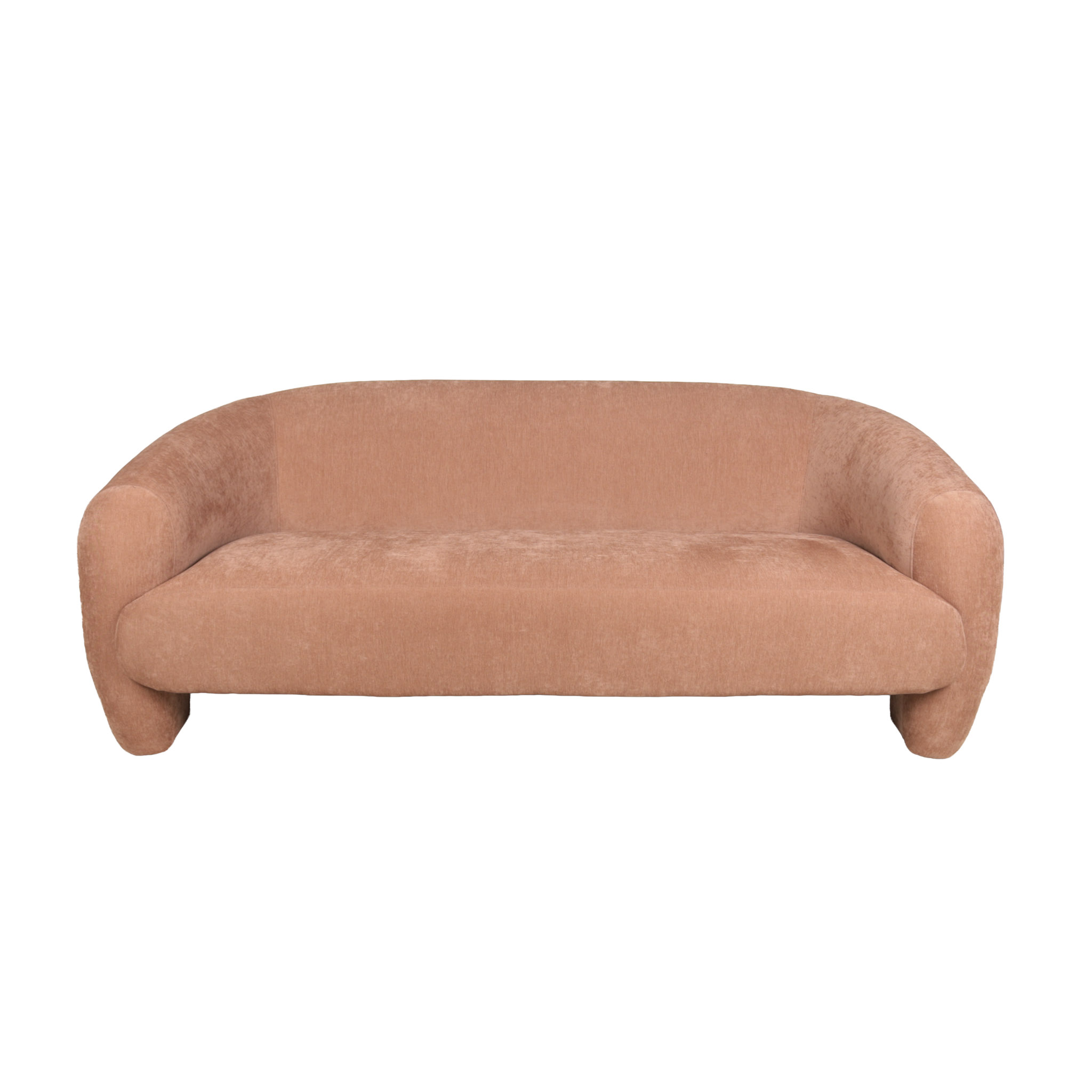 Sofá de dos puestos revestido en tela suave en tono palo rosa y patas de plástico negro.