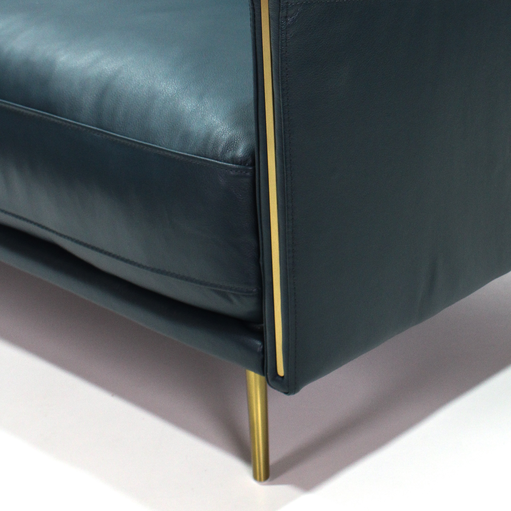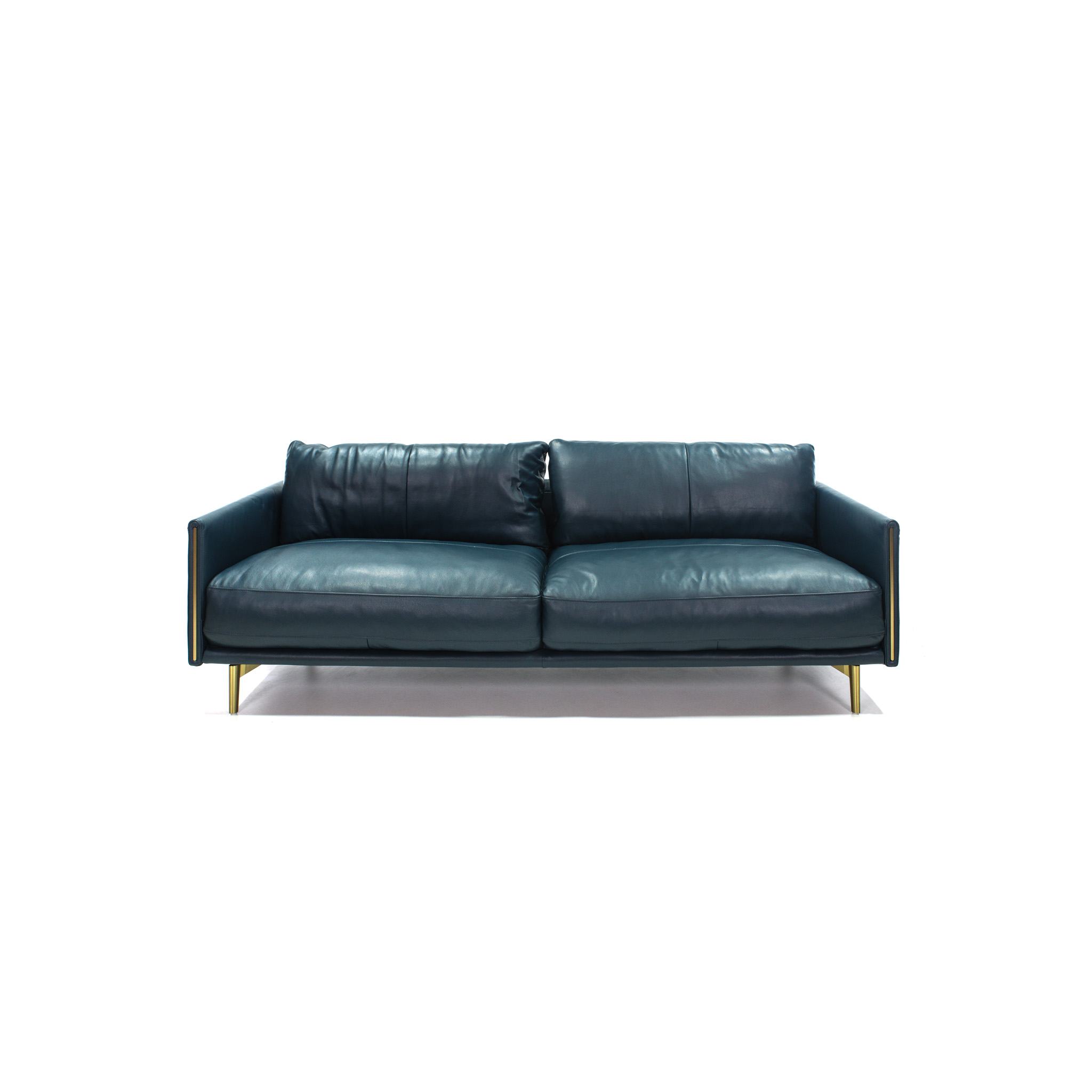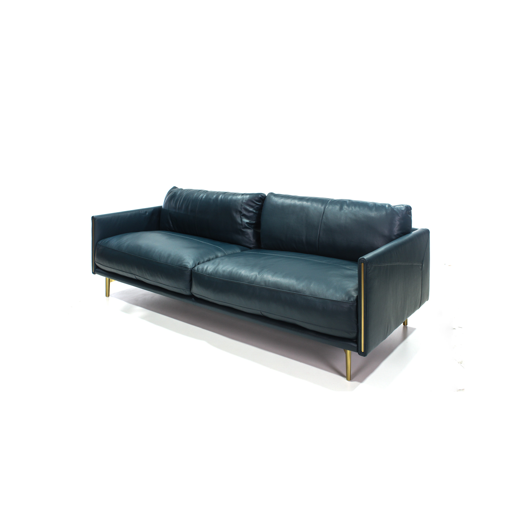 Sofá de tres puestos tapizado en cuero con detalle y patas de acero en color dorado. Este sofá es una combinación de estilo y durabilidad para tu sala de estar, ofreciendo un lugar cómodo y elegante para descansar y relajarse. El tapizado de cuero agrega un toque de lujo y sofisticación al ambiente, creando un espacio acogedor y lleno de estilo en tu hogar.