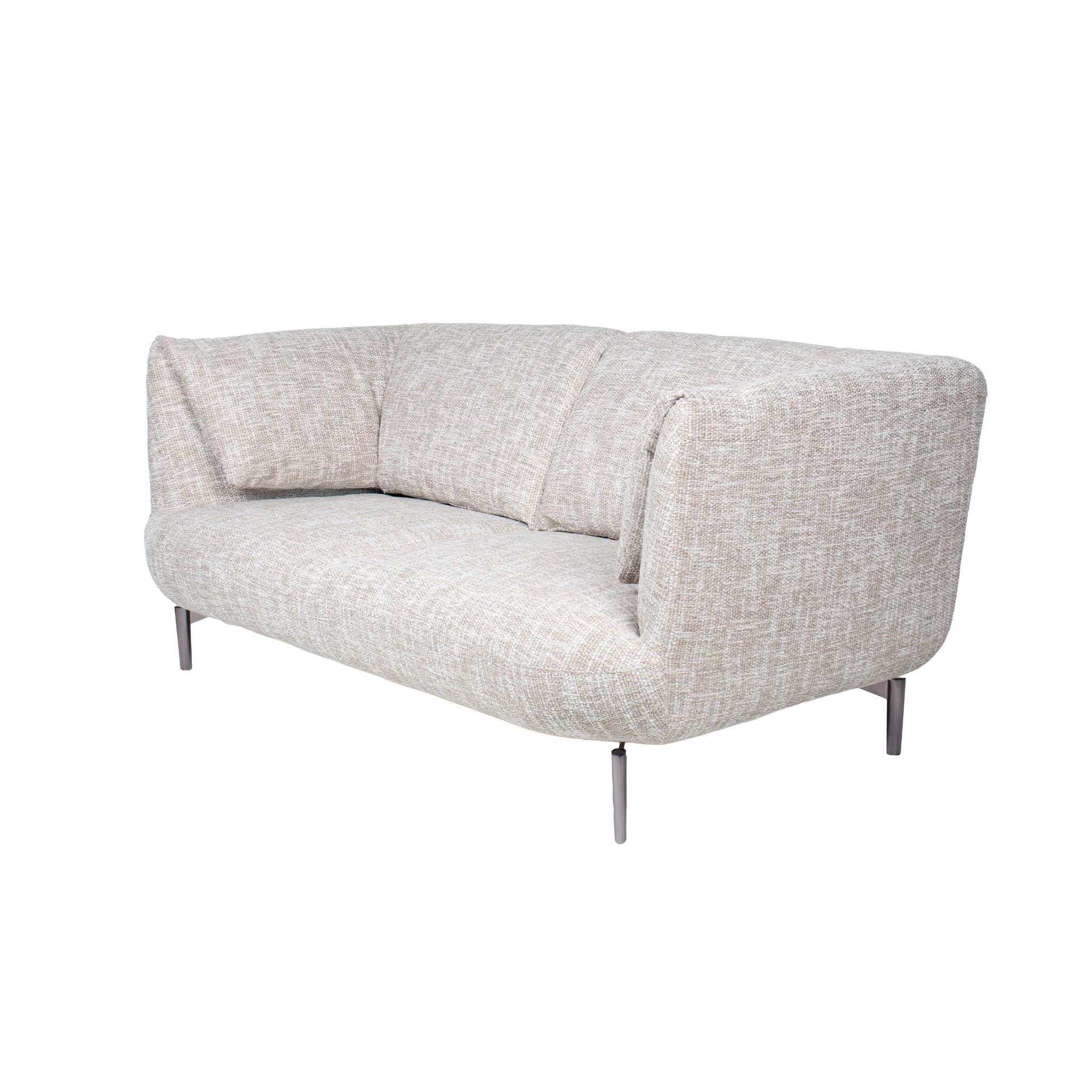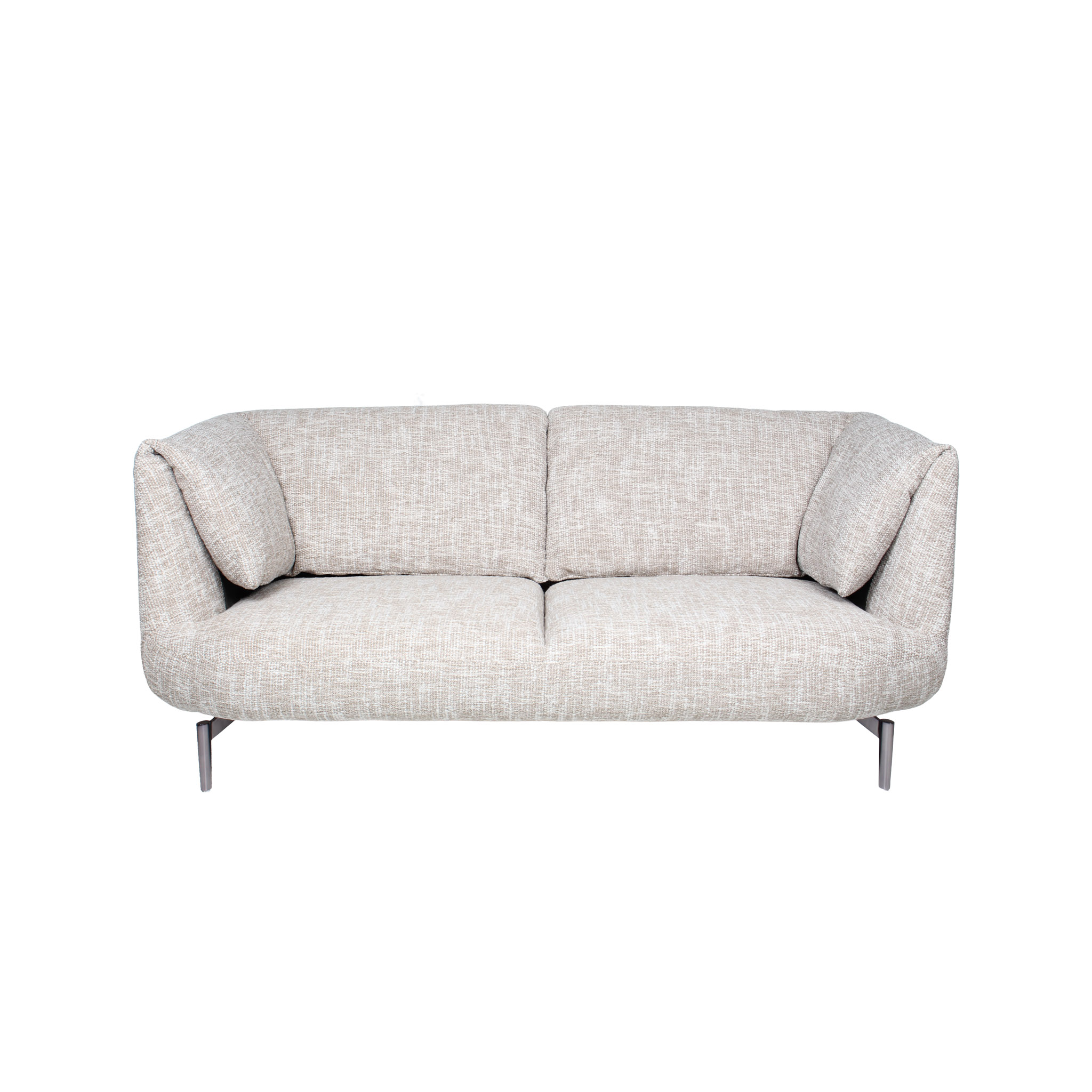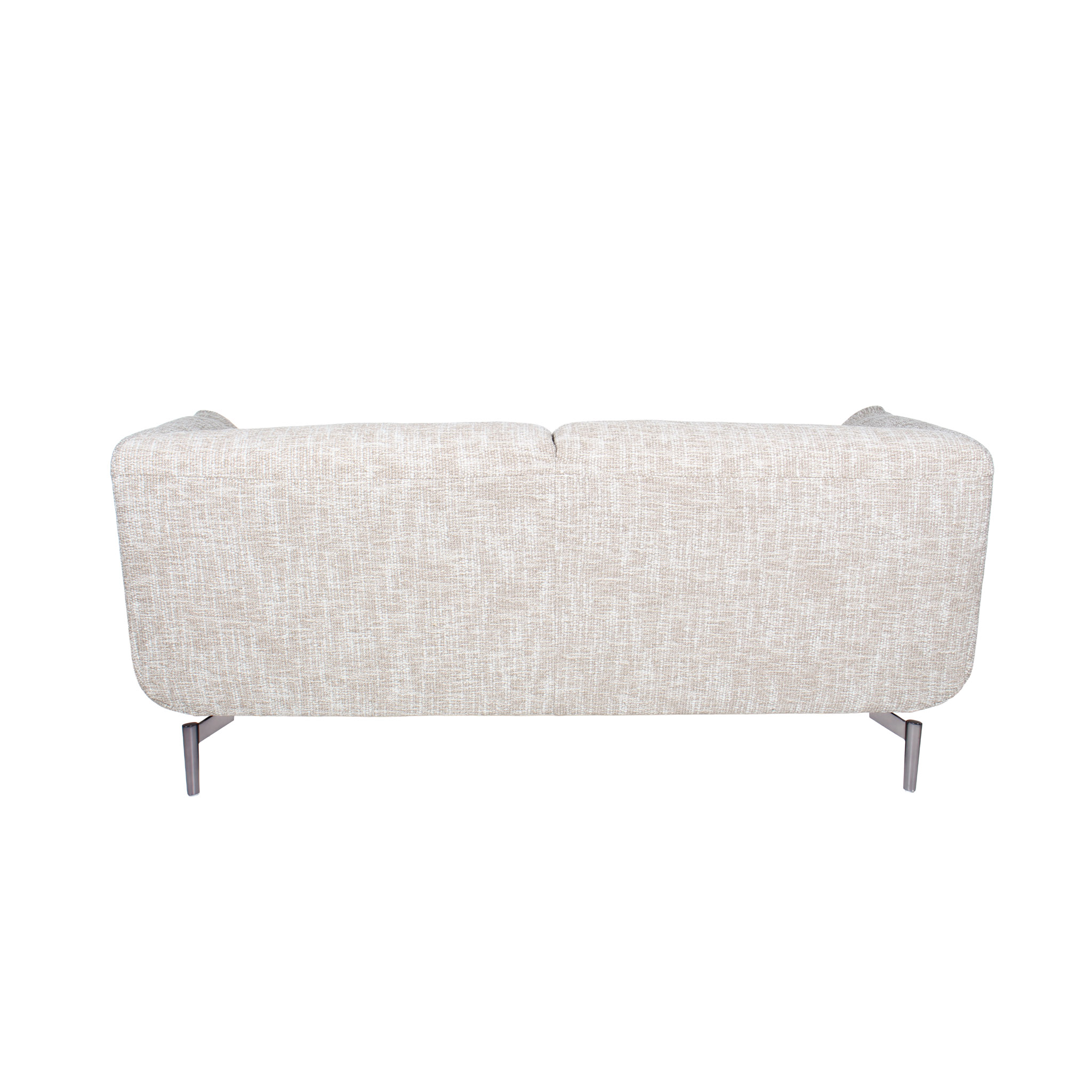 El sofá de dos puestos en tela crema con hilos en color blancos ofrece un diseño sencillo y elegante. Su tonalidad suave aporta luminosidad y calidez al ambiente. Una pieza versátil y atemporal, ideal para salas modernas.