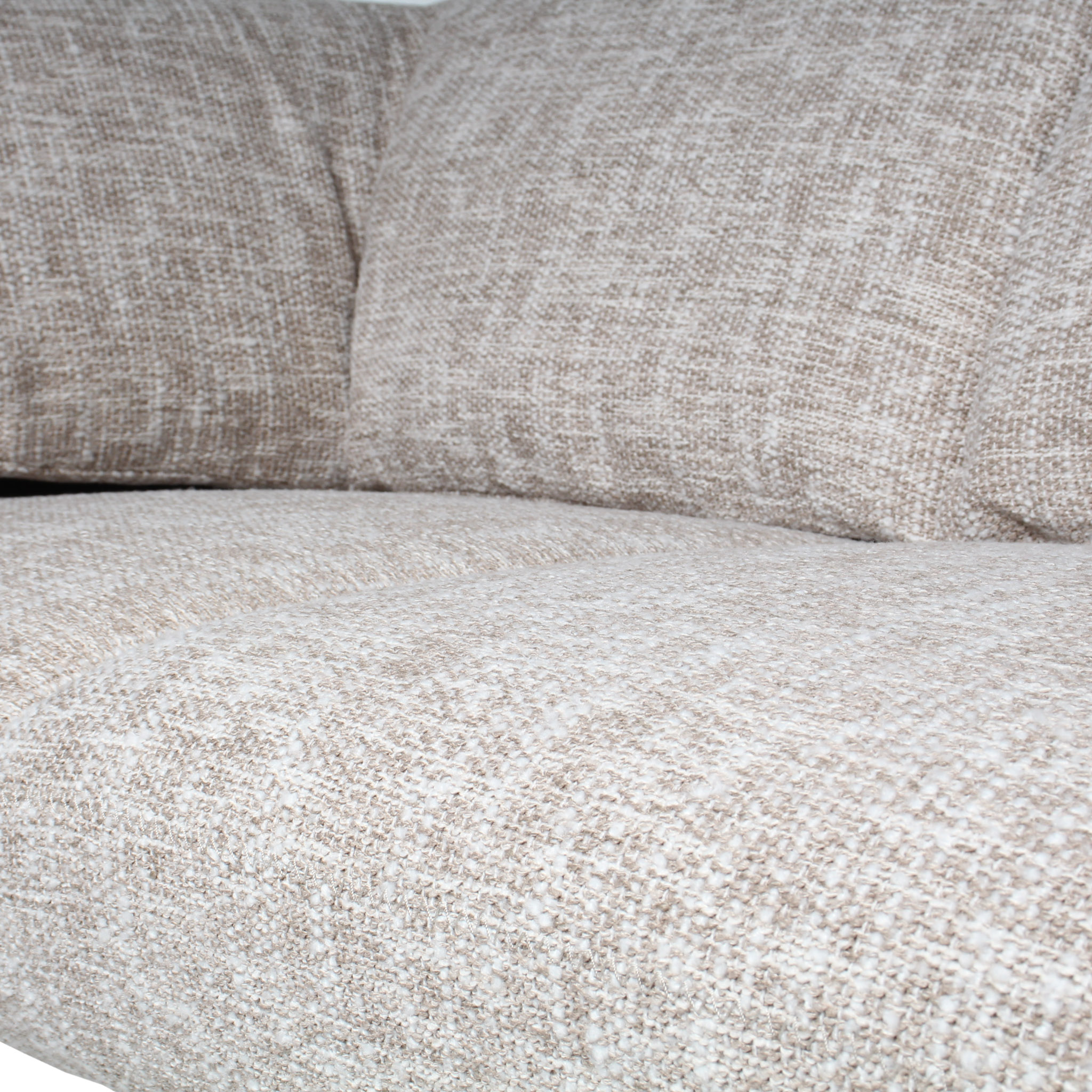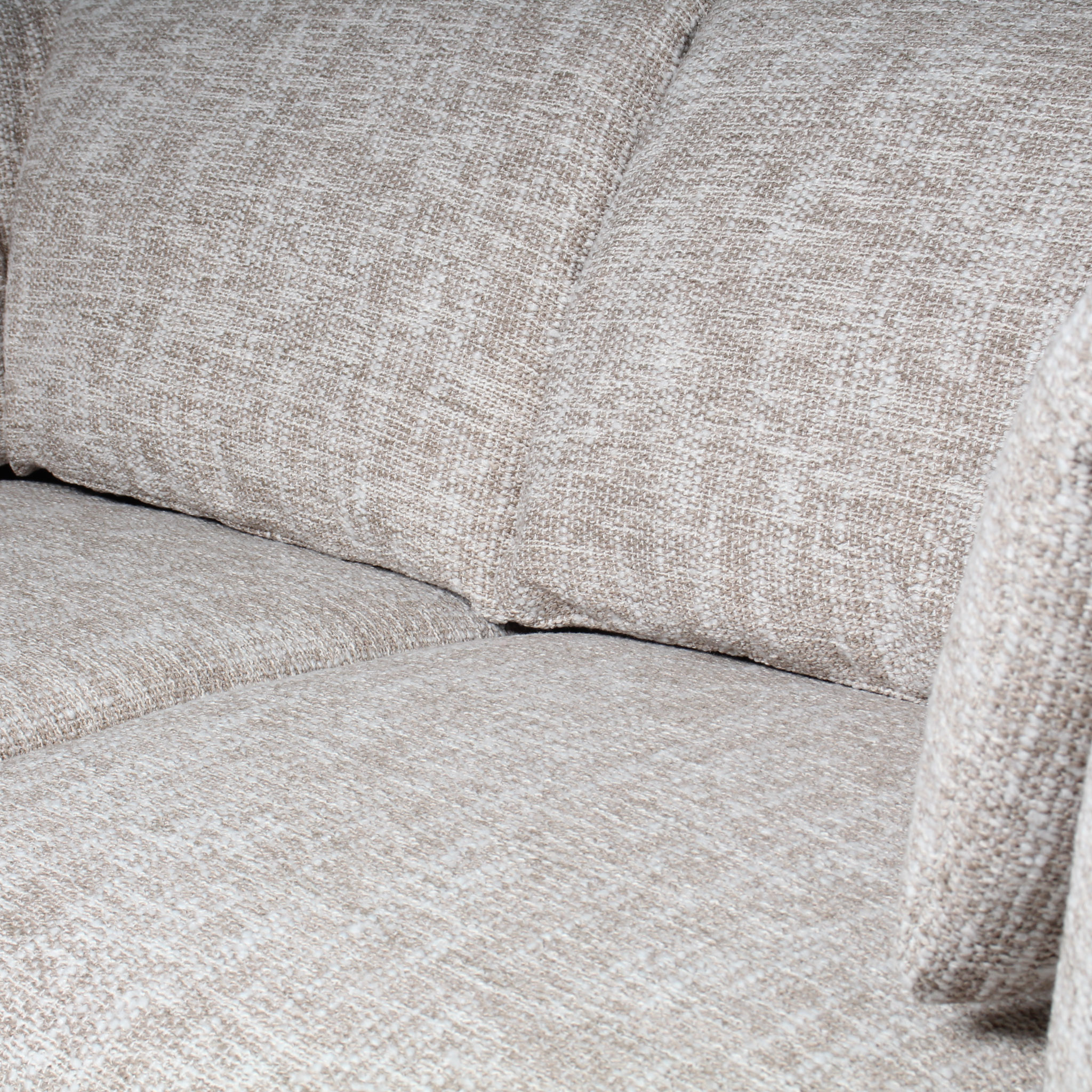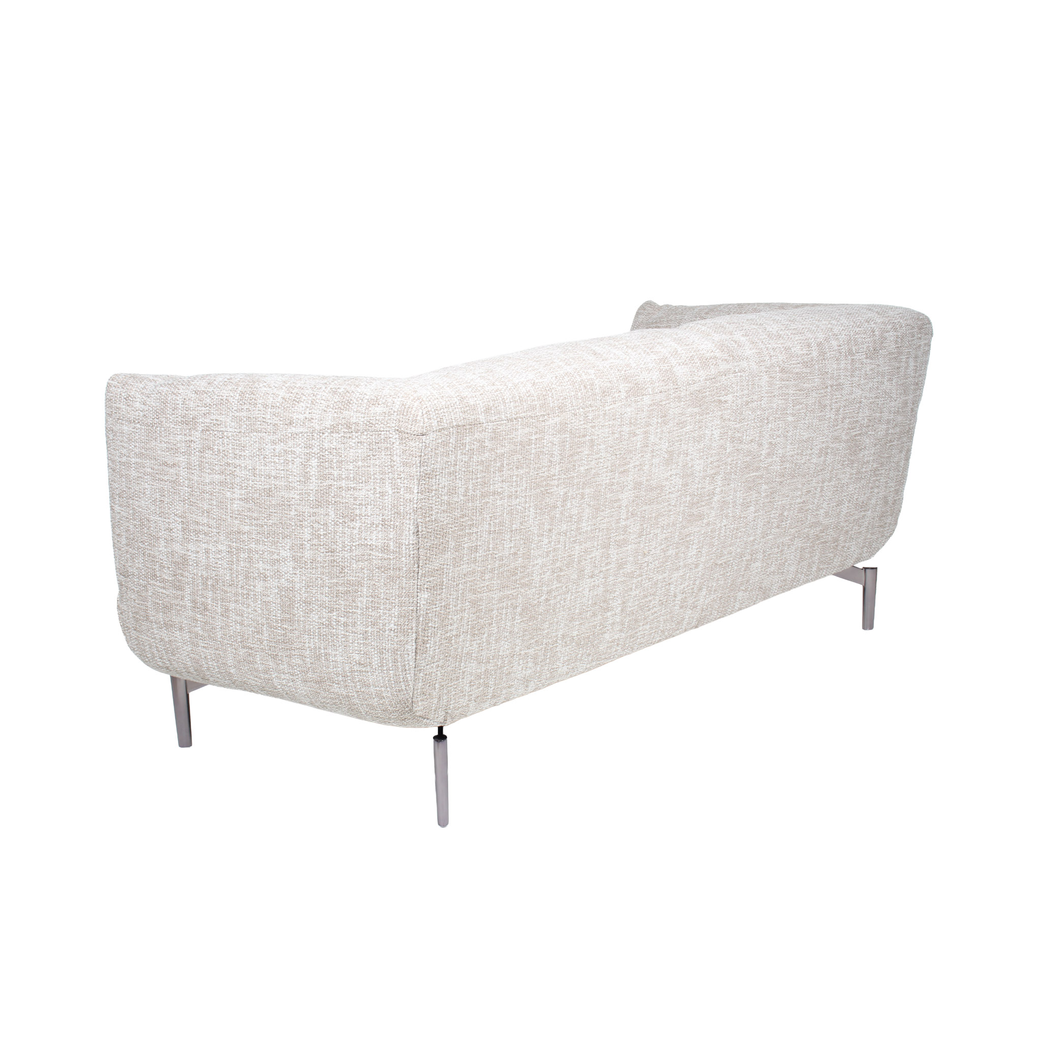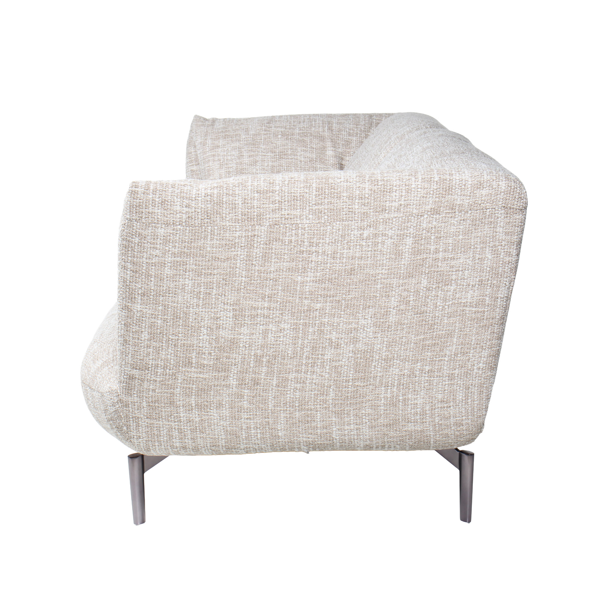 El sofá de dos puestos en tela crema con hilos en color blancos ofrece un diseño sencillo y elegante. Su tonalidad suave aporta luminosidad y calidez al ambiente. Una pieza versátil y atemporal, ideal para salas modernas.