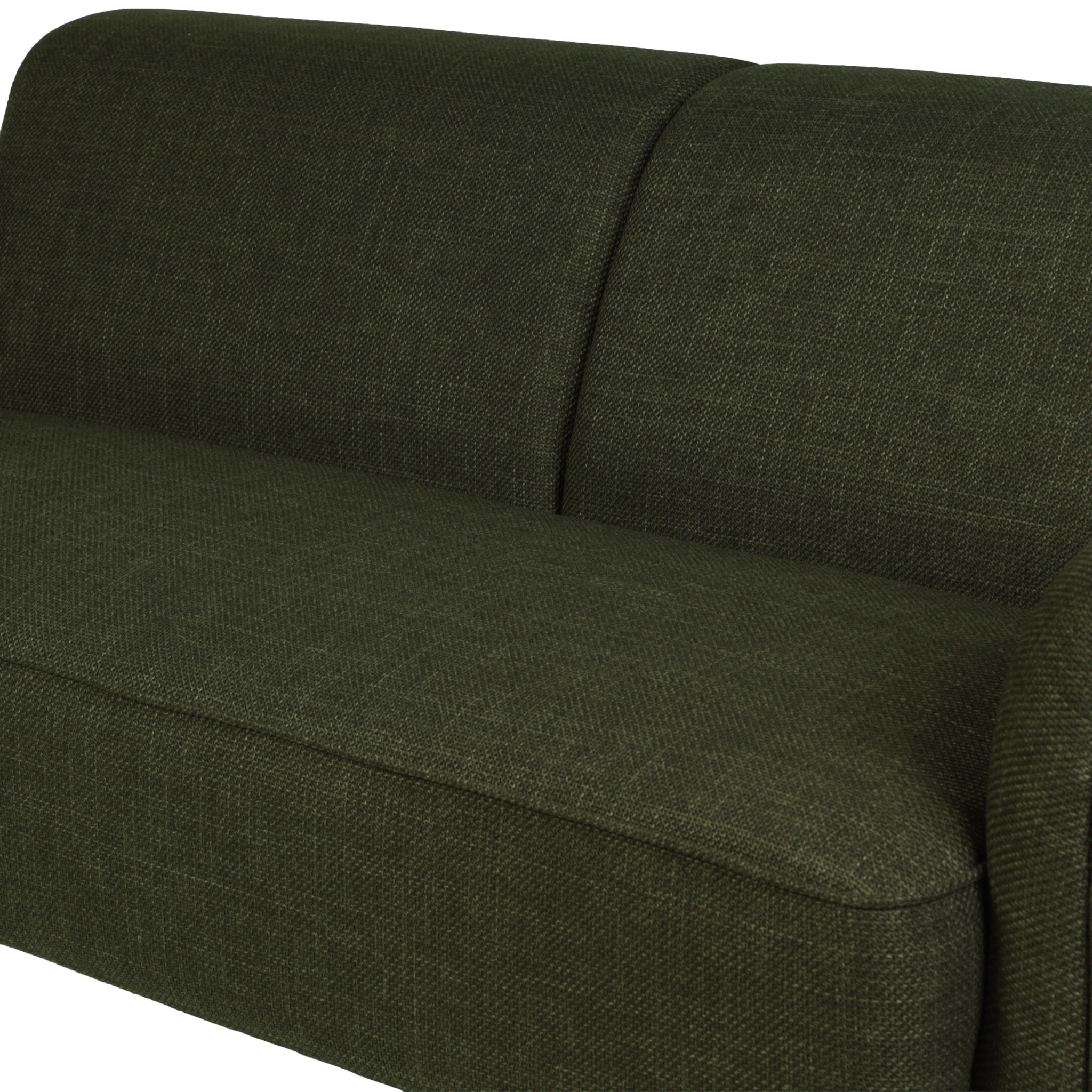 Cómodo sofá de dos puestos de tela en color verde oscuro, y patas de madera natural.