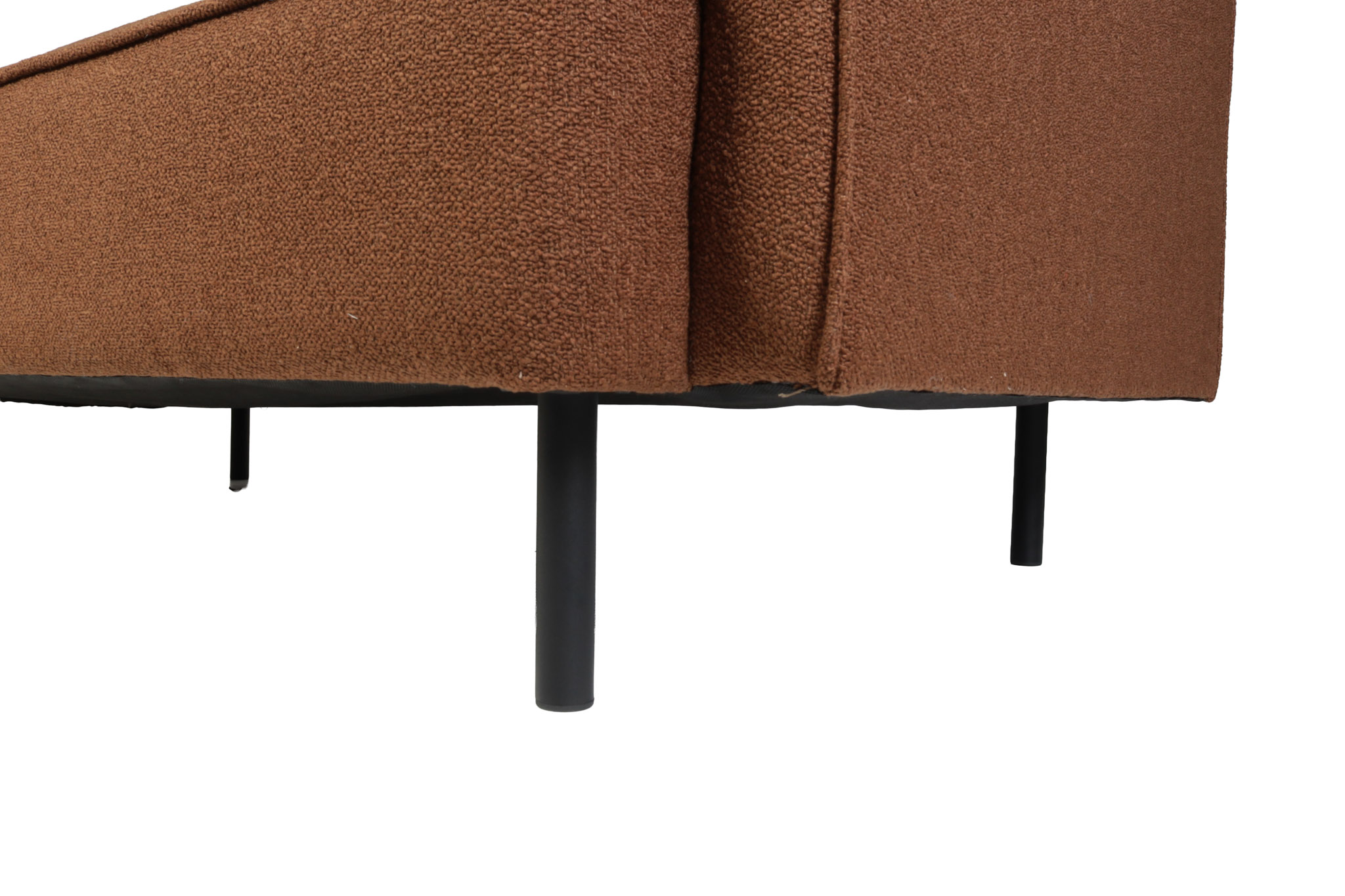 Cómodo sofá de dos puestos de tela en color chocolate, y patas de metal negro.