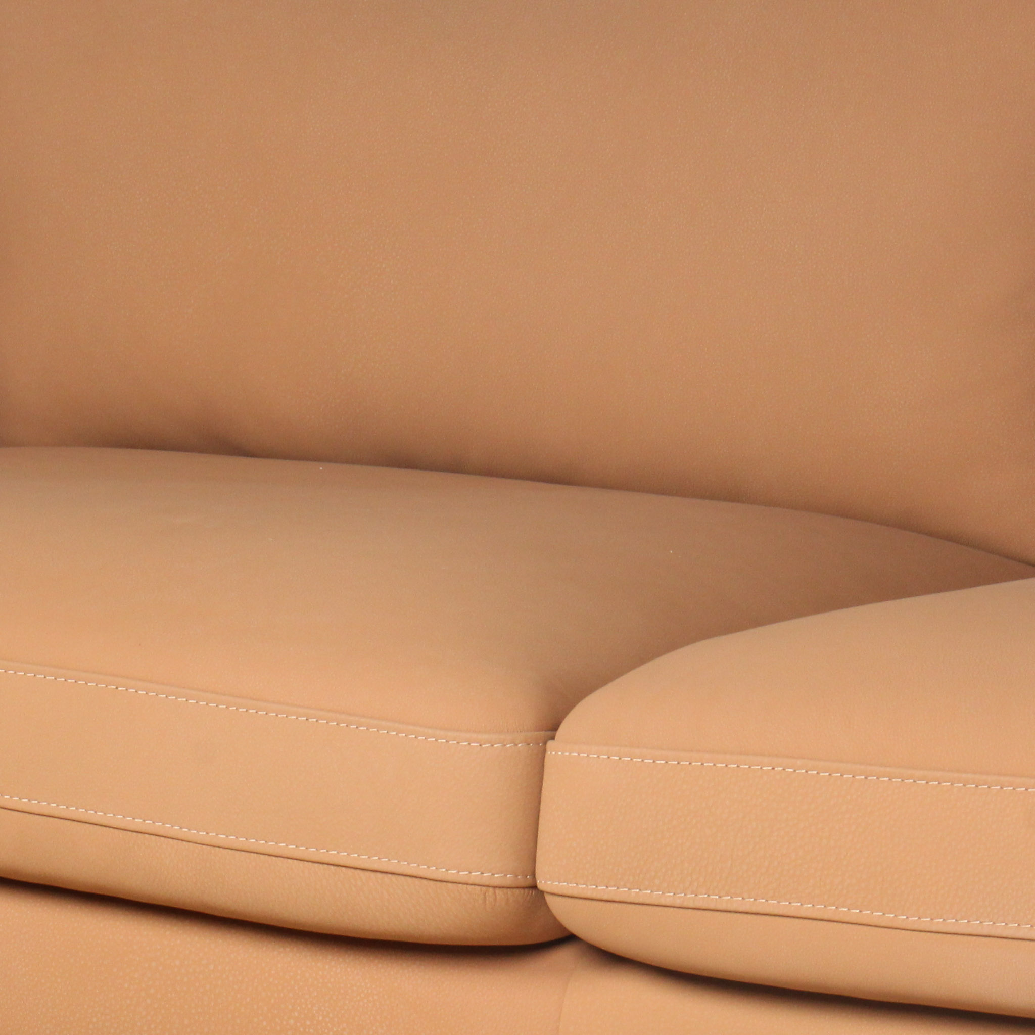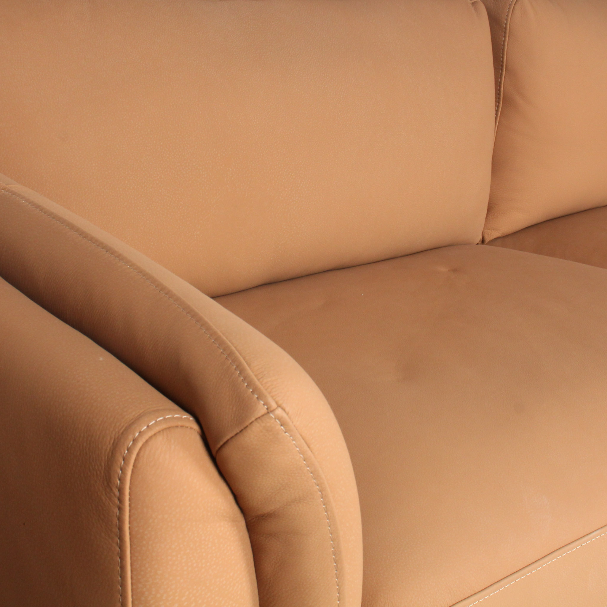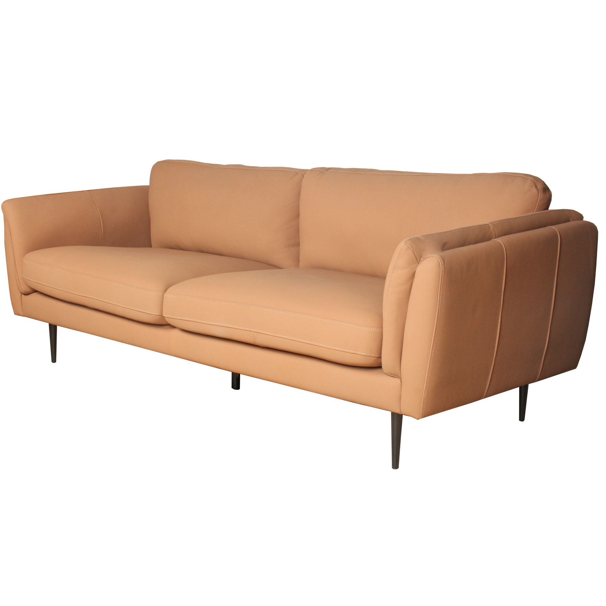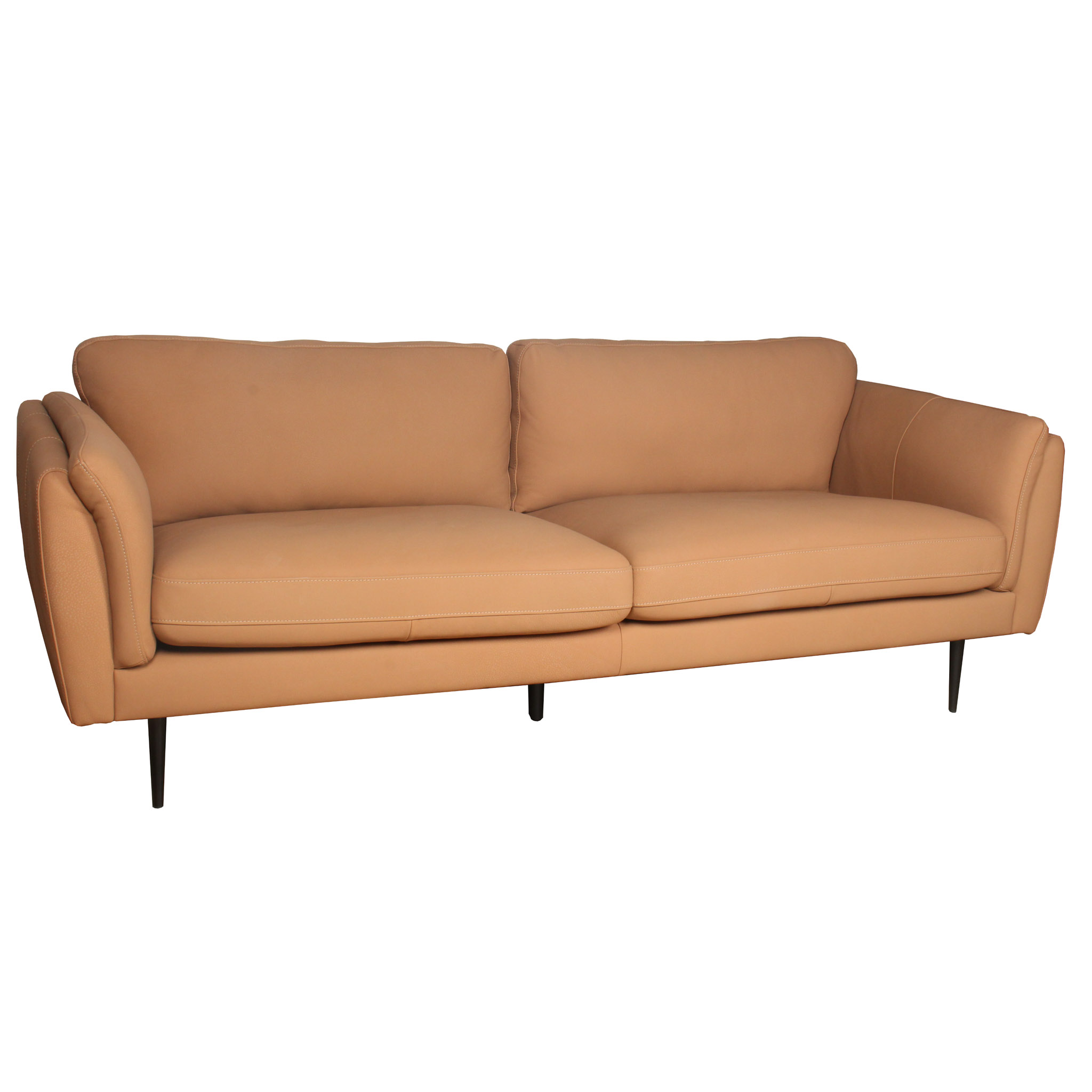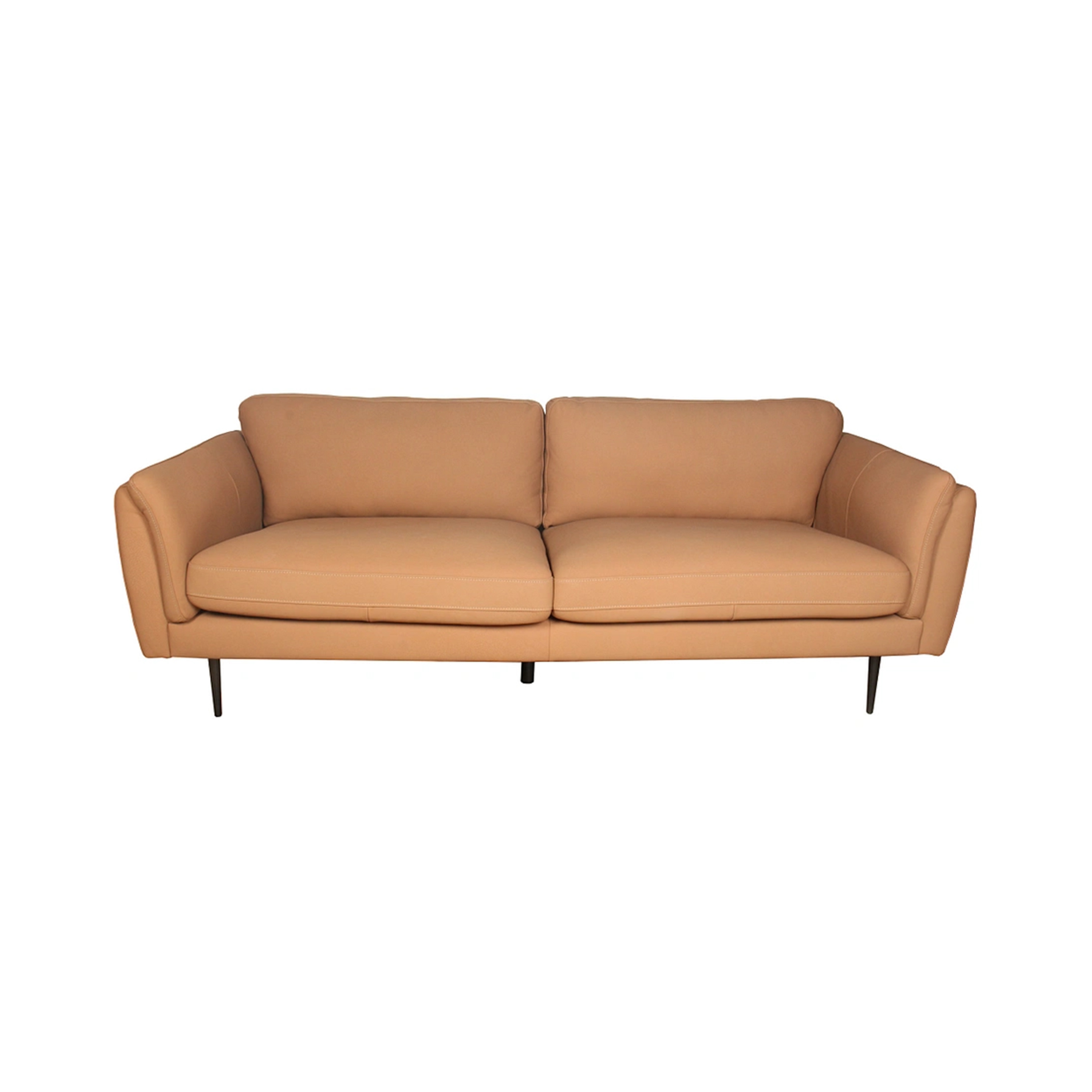 Con un estilo atemporal, este sofá de tres puestos en cuero color camel y patas de metal negro combina lujo y modernidad. Su elegante acabado en cuero lo convierte en el centro de atención de cualquier sala, ofreciendo durabilidad y confort para el uso diario.