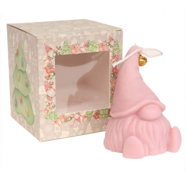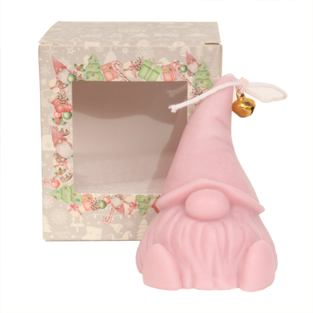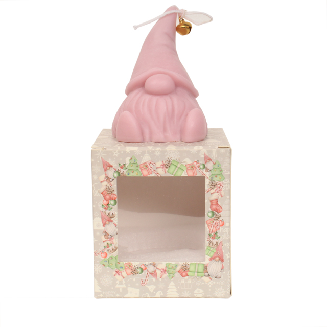 Vela aromática con diseño de gnomo navideño, rosado. Un toque festivo y acogedor que perfuma el ambiente con una fragancia suave, ideal para darle un toque especial a tu decoración navideña. Perfecta para crear una atmósfera cálida y festiva.